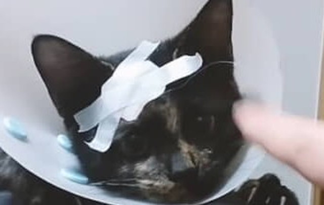 そんなある日、かさぶたになっていた傷が急に膿んできたので病院に連れていくと、傷口がかなり悪い状態であることが判明。頭蓋骨が見えるほど肉が削がれていました。手当のあとはエリザベスカラーを装着。ただ、食欲はあり元気そうです。