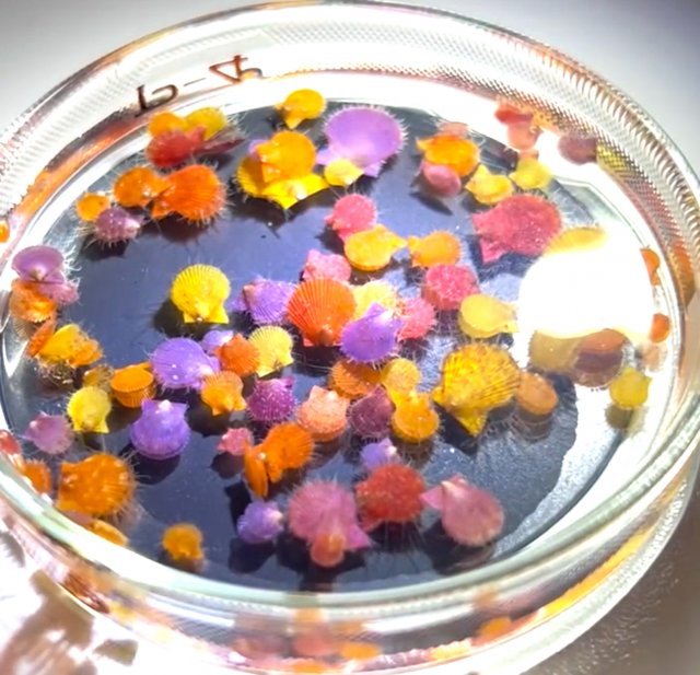 まるで金平糖のような海の生物(写真/でんか@海洋生物観測所より) シャーレの中で赤、黄、紫など、カラフルな色彩の金平糖に見える生き物が、ちょこちょこと動く様子を収めた動画が559.8万回再生を超える反響を呼び、「レジン(樹脂)の作り物かと思ったら動いてる!」「金平糖みたいで可愛い」「キレイな花びらだと思って見てた」などと、コメントが寄せられた。この動画を投稿した海洋生物観測所「ヤドカリの国」の代表・でんかさんに、可愛らしい生物の生態や育て方について話を聞いた。