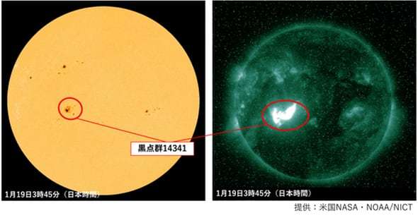 情報通信研究機構(NICT)は1月20日、大規模な太陽フレアが発生し、地球方向へ噴出された高速コロナガスにより、地磁気嵐の発生などが確認されたと発表した。GPSを用いた高精度測位や短波通信、人工衛星の運用などに影響する可能性がある。