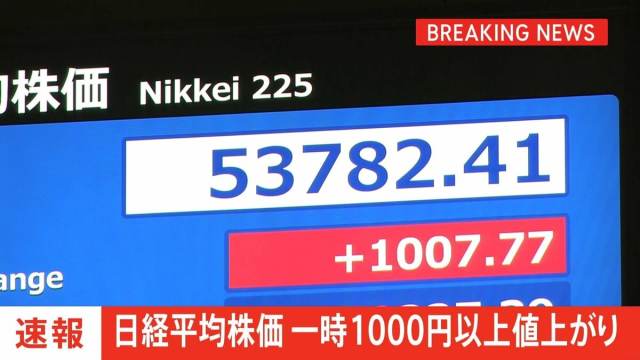 きょうの東京株式市場では、取引開始直後から買い注文が先行し、日経平均株価は一時1000円以上値上がりして、5万3000円台を回復しました。