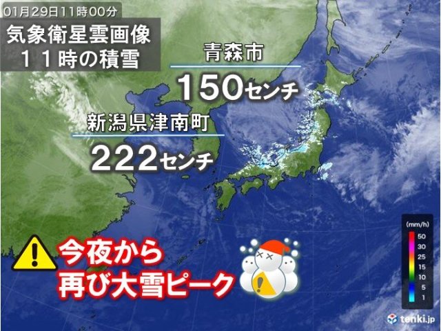 今日29日は冬型の気圧配置が強まり、北陸や東北など日本海側で局地的に雪が強まっています。青森市では今日29日午前0時の積雪が158センチに達し、午前11時現在の積雪は150センチです。青森市で1月に積雪が150センチ以上になったのは、1986年以来40年ぶりのこととなります。青森県八甲田山系の酸ケ湯では午前11時の積雪が473センチで5メートル近くになっています。
