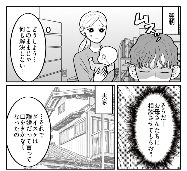 子どもたちを連れて実家に向かった私。これまでの経緯を打ち明けると、両親は真剣な顔をして聞いてくれました。そして父は、ダイスケの主張に不自然な点があることや、ダイスケの言い分が矛盾していることを指摘しました。