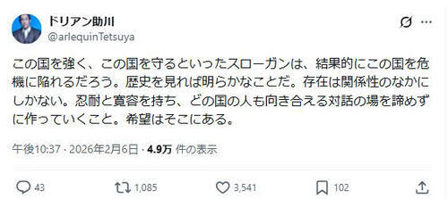 「叫ぶ新人の会」ボーカルで、小説「あん」を書いた作家としても知られる詩人のドリアン助川が7日までにX(旧ツイッター)を更新。衆院選(8日投開票)を前に、「この国を強く、この国を守るといったスローガンは、結果的にこの国を危機に陥れるだろう」と、つづった。