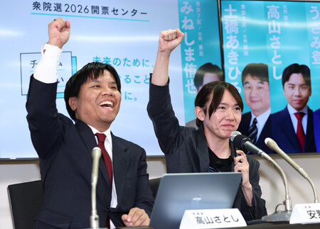 チームみらいの安野貴博党首は開票開始直後に、衆院で初の議席獲得が確実となると、拳を突き上げ候補者と抱き合って喜びを爆発させた。約1時間後には、表情を引き締めて記者会見し、「今まで1人しか議員がいなかったが、これからは本当にチームとして活動をしていく」と力を込めた。
