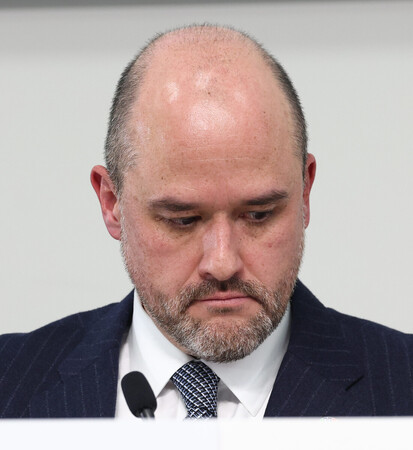 決算発表記者会見を終え、厳しい表情を見せる日産自動車のイバン・エスピノーサ社長=12日午後、横浜市西区