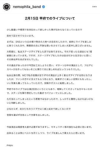 ¥¬¡¼¥ë¥º¥Ð¥ó¥É¡ÖNEMOPHILA¡×¤¬¡¢18Æü¤Ë¥¤¥ó¥¹¥¿¥°¥é¥à¤Î¸ø¼°¥¢¥«¥¦¥ó¥È¤ò¹¹¿·¡£15Æü¤Ë³«ºÅ¤µ¤ì¤¿¹ÃÉÜCONVICTION¤Ç¤Î¥é¥¤¥Ö¤Ç¡¢ÃÔ´ÁÈï³²¤Ë¤¢¤Ã¤¿Æ±¥°¥ë¡¼¥×¤Î¥Ü¡¼¥«¥ê¥¹¥Èmayu¤¬ÅöÆü¤Î½ÐÍè»ö¤òÀâÌÀ¤·¤¿¡£