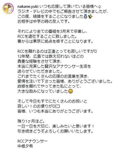 「RCCを離れるのは正直とっても寂しいですが 12年間、広島では数え切れないほどの 貴重な経験をさせて頂き、本当に充実した贅沢なアナウンサー生活を送らせていただきました。これまでたくさんの応援のお言葉を頂き、愛情を注いで下さった皆様、ありがとうございました。故郷を離れてやってきた私にとって、大きな励みになっていました」と記述。
