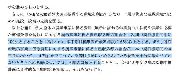 また展示事業の自己収入の割合が(次の中期の4年目で)40%を下回ったという点だけをもって、すぐ再編ではありません。収集や保管、教育など各役割を総合的に評価した上で、社会的な役割を果たせていないと判断された場合に再編を検討する(=該当する博物館など自身が次期中期計画に再編内容を記載し実行する)ということです。
