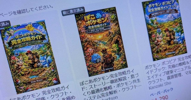 3月6日時点で、Amazon上で「ぽこ あ ポケモン 攻略本」と検索すると、5件がヒット。そのうち1件は小学館が発行する書籍だが、残り4件は全て個人が発行した書籍となっている。いずれも表紙は生成AIで作成したものと思われ、ポケモンには登場しないキャラクターをデザイン。小学館の攻略本の価格が1980円なのに対して、偽物と思われる攻略本は4290〜4950円と倍以上の価格で売られている。