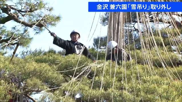 国の特別名勝、金沢市の兼六園では、冬の間、雪から樹木を守るために施されていた「雪吊り」を取り外す作業が始まりました。