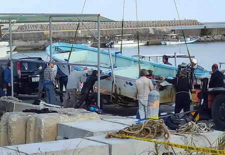 辺野古沖で転覆し、岸壁に引き揚げられた平和丸=16日午後、沖縄県名護市の辺野古漁港 女子高生ら2人が犠牲となった船転覆事故現場に近い沖縄県名護市の辺野古漁港では16日午後、転覆した2隻の引き揚げ作業が行われた。見守った関係者は「つらいですね。若い命が」と声を詰まらせた。