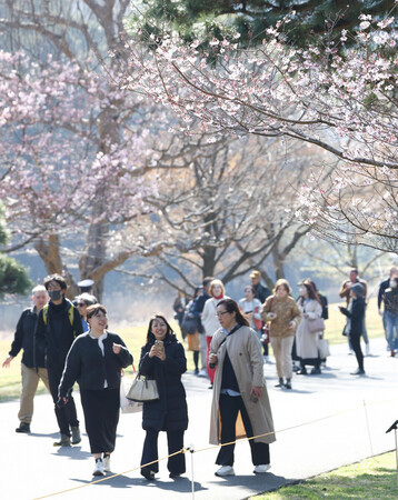 春の一般公開が始まった皇居・乾通りで、散策を楽しむ人たち=21日午前、東京都千代田区