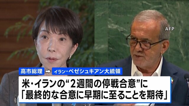 高市総理はイランのペゼシュキアン大統領と電話会談し、アメリカとイランの“2週間の停戦合意”について、「最終的な合意に早期に至ることを期待している」と伝えました。