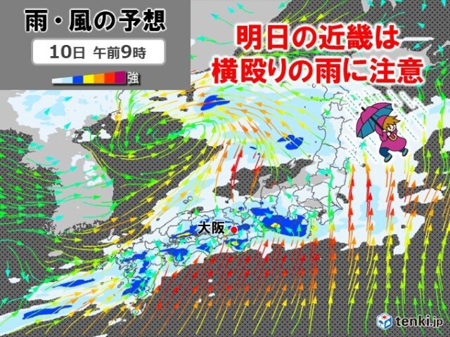 今日9日の近畿は、このあと西から次第に雨雲が流れ込み、夜は広く雨が降るでしょう。明日10日は雨や風が強まり、荒れた天気となるため、横殴りの雨にご注意ください。傘は大きめで丈夫なものを用意し、さらにレインコートなどがあると役に立つでしょう。