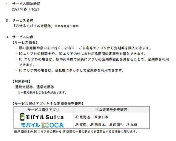 JRグループは4月10日、交通系ICカードの利用エリア外の駅でも、「モバイルSuica」「モバイルICOCA」のアプリ画面を係員に見せることで、定期券として利用できる「みせるモバイル定期券」サービスを、2027年春から始めると発表した。