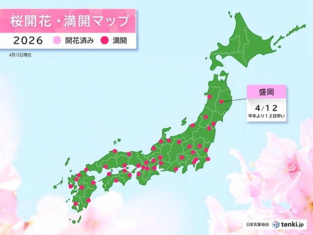 今日4月12日は、盛岡(岩手)から桜(ソメイヨシノ)満開の便りが届きました。平年より12日も早い満開です。盛岡で4月12日の満開は、2023年の4月6日に次いで2番目に早い記録です。今年のお花見の計画は早めが良さそうです。