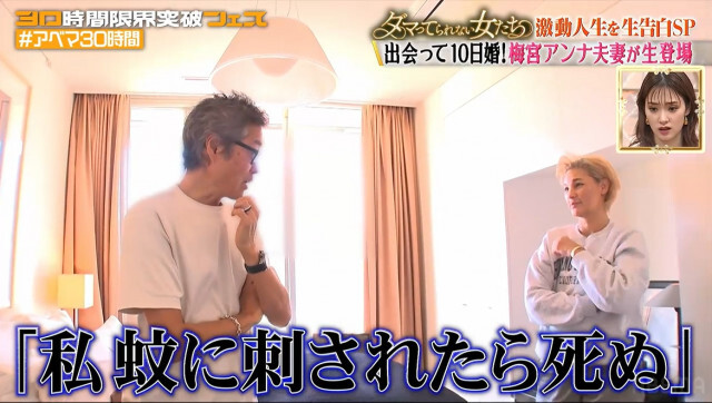 梅宮は「切り傷とか、蚊とか、日焼けとかもいけないんですけど、すごい腫れちゃうんですよ。蜂に刺されたみたいに。私は深爪から」と告白。世継氏は「結婚した当初に『私蚊に刺されたら死ぬんだよ』って」と梅宮から明かされたと明かし、実際に虫に刺されて亡くなった例もあると心配の表情を見せていた。