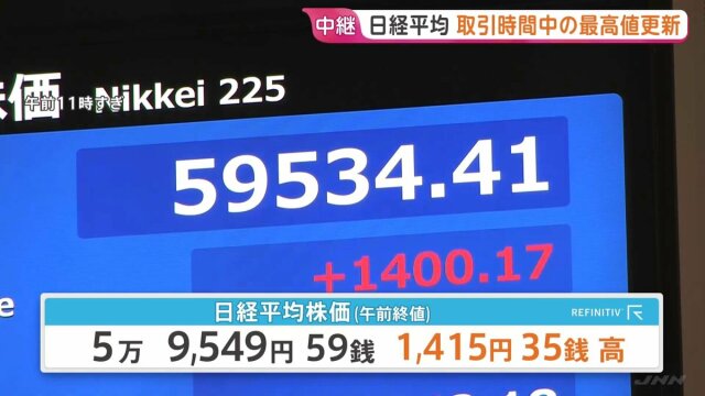 寄りつきから上昇を続けた日経平均株価、午前中だけで1400円を超えて上昇し、終値は5万9500円を超えました。