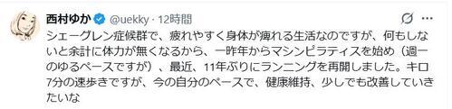 「シェーグレン症候群で、疲れやすく身体が痺れる生活なのですが、何もしないと余計に体力が無くなるから、一昨年からマシンピラティスを始め(週一のゆるペースですが)、最近、11年ぶりにランニングを再開しました」と持病を告白。