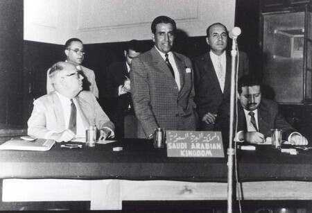 1960年9月、バグダッドで開かれた主要産油5カ国の会合に参加するサウジアラビア代表団トップのアブドラ・タリキ氏(中央)。4日間の協議を経て、石油輸出国機構(OPEC)の結成が決まった(AFP時事) 【ロンドン時事】アラブ首長国連邦(UAE)が中東情勢の不安定化に背中を押される形で石油輸出国機構(OPEC)の離脱を決めた。原油価格を巡って加盟国間の調整役を担ってきたUAEの脱退は「1960年の結成以来、最大の打撃」(欧米メディア)とも言われ、世界市場におけるOPECの影響力低下は必至だ。