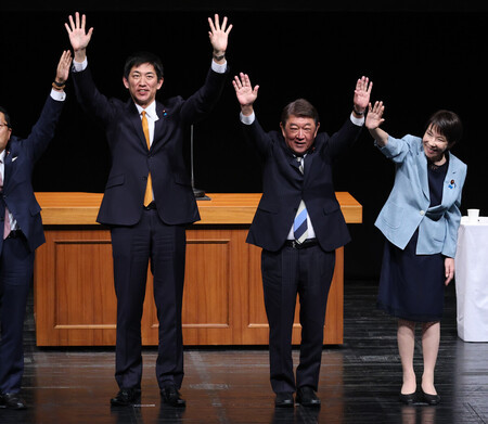 自民党総裁選の演説会に登壇した3候補。(左から)小林鷹之氏、茂木敏充氏、高市早苗氏=2日、大阪市北区 自民党の小泉進次郎農林水産相と林芳正官房長官は2日に大阪市で開かれた党総裁選の演説会を欠席した。会場では事前収録された2人の動画が流れた。現職閣僚として公務を優先したためだが、現地で演説した他候補の陣営からは不満が漏れた。