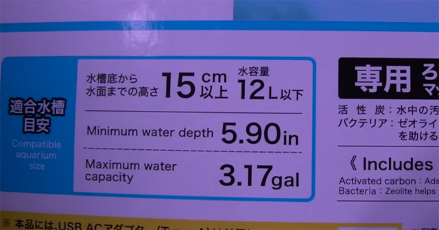 今回レビューするのは「水槽用外掛けフィルター」(1100円)。水槽底から水面までの高さが15センチ以上あり、水容量12リットル以下のサイズの水槽に適合する商品です。