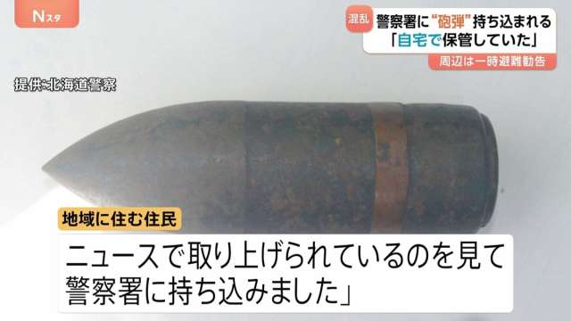 警察によりますと、きょう午前、地域に住む住民から岩見沢警察署に砲弾のようなものが持ち込まれ、その際に住民が「自宅で砲弾のようなものを保管していました。最近ニュースで取り上げられているのを見て警察署に持ち込みました」と話したということです。