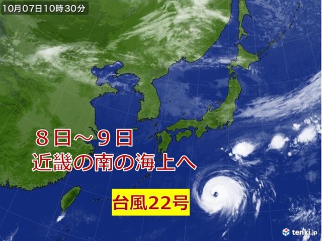 明日8日から9日(木)にかけて、台風22号が近畿の南の海上を進む予想です。近畿地方は雲が広がりやすく、雨の降る所があるでしょう。太平洋沿岸部を中心に風が強まり、強風や高波に注意が必要です。