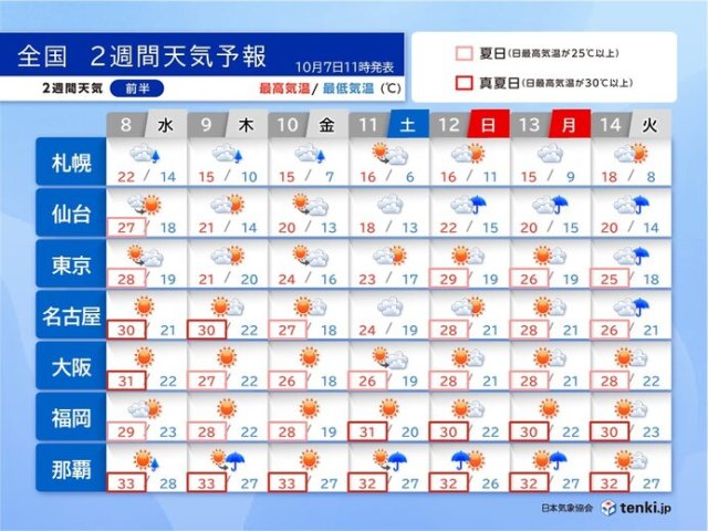 10日(金)と11日(土)は広い範囲で晴れますが、北海道や東北は日中も空気がヒンヤリ。札幌では朝晩の気温が10℃を下回りそうです。関東は23℃から24℃くらいの所が多く、過ごしやすいでしょう。12日(日)から14日(火)にかけては、前線に近い東北や北陸で雨が降りそうです。