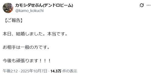 「現役書店員芸人」として知られる、お笑いコンビ「デンドロビーム」のカモシダせぶん(37)が8日までにX(旧ツイッター)を更新。一般女性と結婚したことを報告した。