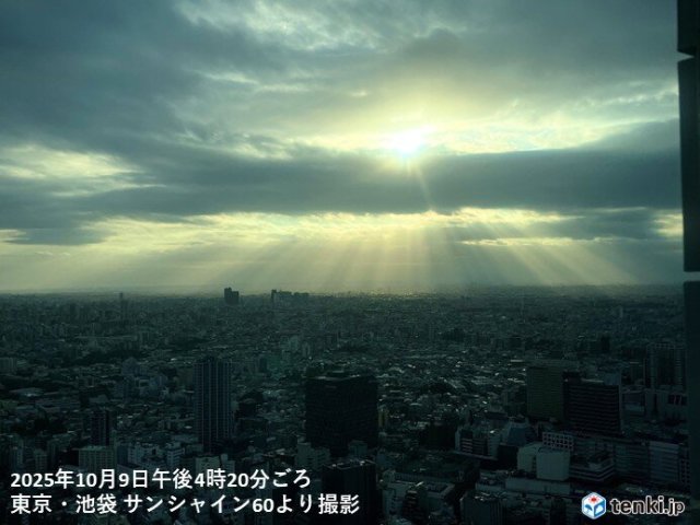 今日9日の日中は雲に覆われた所の多かった関東ですが、夕方になり日差しが出てきています。東京都心では雲の切れ間から日が差して「天使のはしご」が現れました。