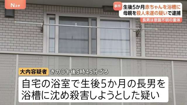 埼玉県の自宅で生後5か月の長男を浴槽に沈め殺害しようとしたとして、41歳の母親が逮捕されました。長男は意識不明の重体となっています。