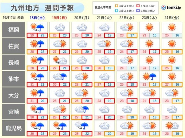 明日18日の九州は、前線の南下に伴い、午後を中心に一時雨や雷雨になるでしょう。この雨を境に、来週は秋の涼しい空気が流れ込み、季節が進みます。朝晩はぐっとに気温が下がってきますので、衣替えを進めておきましょう。