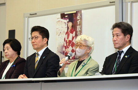 高市早苗首相との面会後、記者会見する横田早紀江さん(右から2人目)。左端は拉致被害者の曽我ひとみさん=23日午後、東京都千代田区