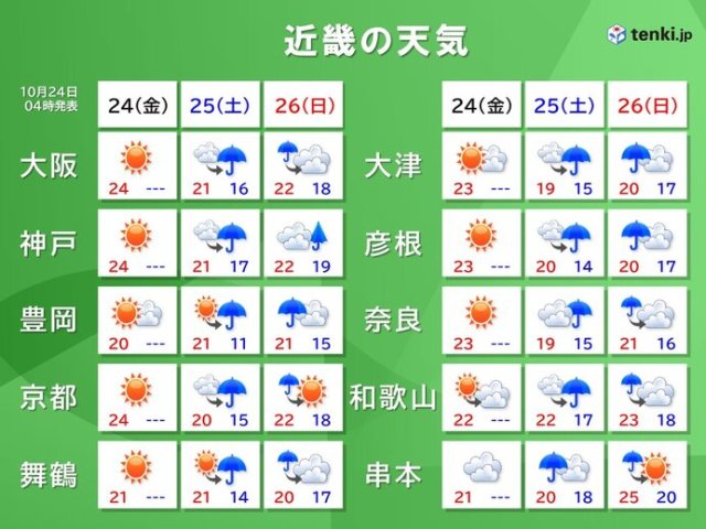 今日24日も、近畿地方は中部と北部を中心に、広い範囲で晴れるでしょう。朝は冷えていますが、日中は長袖一枚でも過ごせる快適な気温となりそうです。一転して土日は雨が降ったりやんだり。特に日曜日は、広く本降りの雨となる可能性もあります。