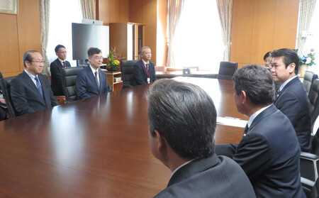 今年のノーベル賞受賞が決まり、松本洋平文部科学相(右手前から3人目)を表敬訪問する京都大の北川進特別教授(奥左)と大阪大の坂口志文特任教授(同中央)=30日午後、東京都千代田区 今年のノーベル賞受賞が決まった大阪大の坂口志文特任教授(74)と京都大の北川進特別教授(74)が30日、松本洋平文部科学相を表敬訪問した。両氏はそろって基礎科学研究や若手研究者の育成の重要性を訴え、国からの支援を充実させるよう求めた。