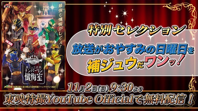 大丈夫。『補充計画』で補ジュウしましょう!毎週TTFCで配信している『ゴジュウジャー補充計画 ナンバーワン懺悔室』。この度「特別セレクション」として11月2日午前9時30分より11月3日までの期間限定で東映特撮YouTube Officialで配信することが決定しました!