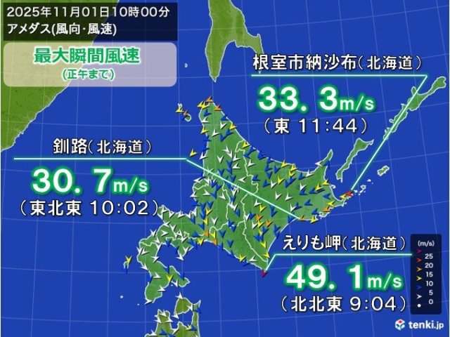 今日11月1日(土)、前線を伴った低気圧が北日本の太平洋側を急速に発達しながら北東へ進んでいます。北海道や東北では、低気圧に近い太平洋側を中心に風が強まっており、北海道ではえりも岬で49.1m/s(北北東、9:04)、根室市納沙布で33.3m/s(東、11:44)、釧路で30.7m/s(東北東、10:02)の最大瞬間風速を観測するなど、台風並みの暴風が吹き荒れています。東北でも、八戸(青森)で、最大瞬間風速36.5m/s(北、6:23)を観測しています。
