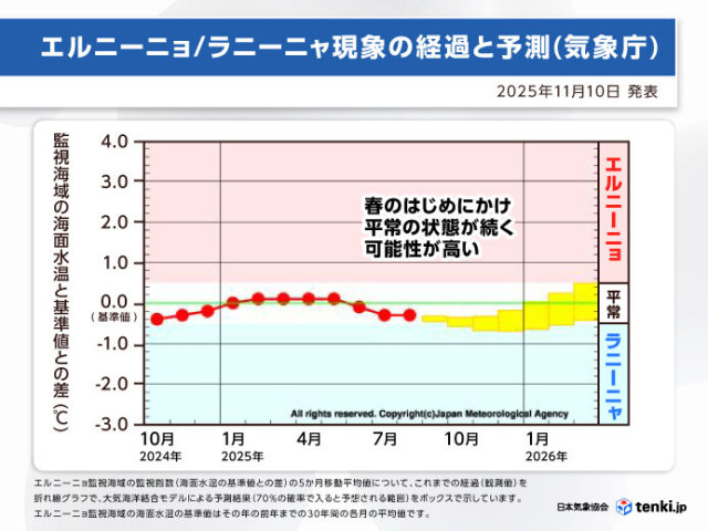 気象庁は今日10日、エルニーニョ監視速報を発表しました。エルニーニョ現象もラニーニャ現象も発生していない平常な状態となっていますが、ラニーニャ現象に近い状態となっています。今後、冬のはじめにかけて、ラニーニャ現象に近い状態が続く見通しです。ただその後は急速に解消するため、ラニーニャ現象の発生には至らず、春のはじめにかけて平常の状態が続く可能性が高くなっています。