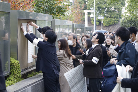 司法試験の合格発表を確認する受験者ら=12日午後、法務省 法務省は12日、2025年の司法試験の結果を発表した。3837人が受験し、1581人が合格。合格者数は政府目標の1500人を3年連続で上回った。女性合格者は479人と全体の30.30%を占め、3割を初めて超えた昨年の30.21%を上回った。