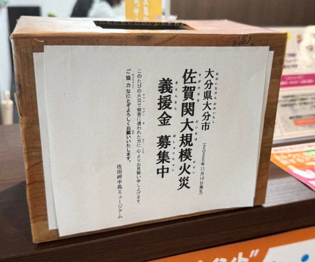 大分市佐賀関の住宅街で起きた大規模火災の被災者に役立ててもらおうと、四国側の対岸・佐田岬半島(愛媛県伊方町)にある町の文化交流施設・佐田岬半島ミュージアムは19日、館内で義援金募集を始めた。