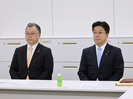 選挙制度に関する実務者協議に臨む自民党の加藤勝信政治制度改革本部長(右)と日本維新の会の浦野靖人選対委員長代行=2日、国会内