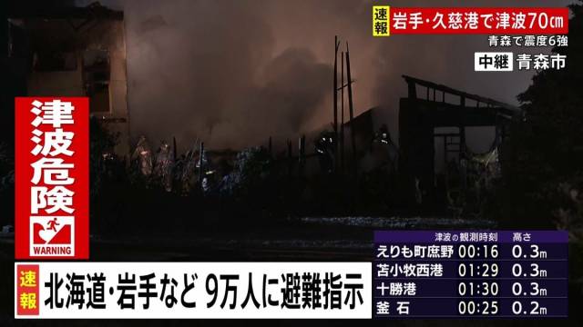 総務省消防庁によりますと、青森県東方沖を震源とする地震で、9日午前0時15分現在、北海道内のおよそ2万3000人、岩手県内のおよそ6万7000人など、1道4県のあわせて20市町村、およそ9万人に避難指示が出ています。