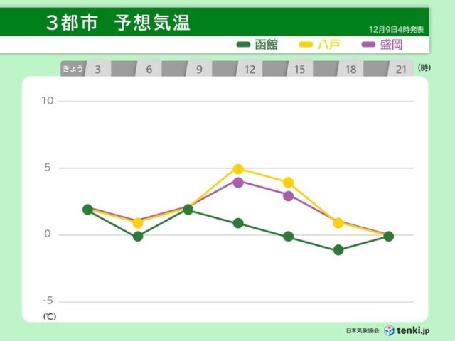 午前4時現在の気温は、青森県八戸市で2.0℃、岩手県盛岡市で2.6℃、北海道函館市で0.6℃となっています。気温は朝からあまり上がらず、最高気温は八戸と盛岡で5℃、函館で2℃の予想です。東北と北海道の日本海側は断続的に雪が降り、太平洋側も内陸や山沿いを中心に雪雲が流れ込んでくるでしょう。冷たい風も吹いて、夜は再び冷え込みそうです。