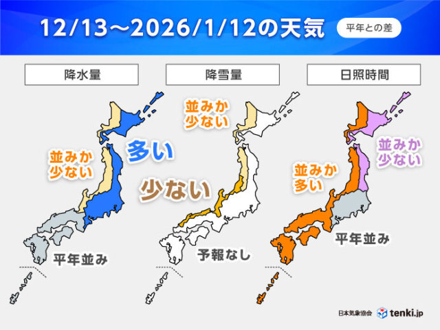 12月20日頃からは冬型の気圧配置が長続きせず、北・東日本の日本海側の雪や雨は少なくなるでしょう。一方で、北・東日本の太平洋側は低気圧の影響を受けやすく、くもりや雨の日が多くなりそうです。11月中旬以降、太平洋側では降水量が極端に少なくなっているため、恵みの雨となるでしょう。西日本の日本海側と沖縄・奄美では、平年と同様に、曇りや雨、または雪の日が多くなりそうです。