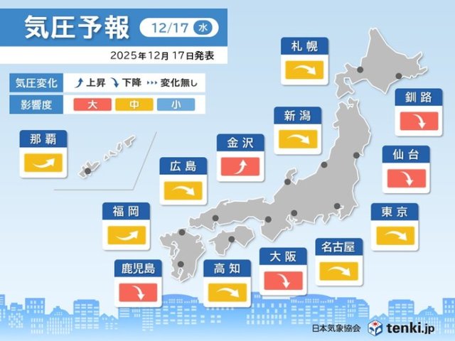 今日17日(水)の気圧予報では、鹿児島、金沢、大阪、仙台、釧路で影響度が「大」となっています。気圧の変化で体調を崩しやすい方は、頭痛やめまいなどにご注意ください。