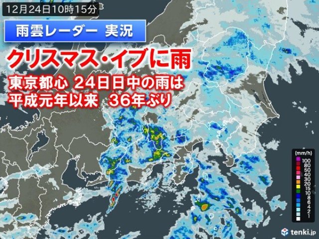 今日24日クリスマス・イブの関東は明け方から雨のエリアが広がり、次第に本降りに。東京都心は午前9時以降は0.5ミリの雨を観測しています。都心で24日クリスマス・イブの日中(9時-18時)に0.5ミリ以上の雨を観測したのは、1989年(平成元年)以来36年ぶりのことです。