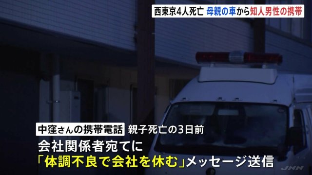 東京・西東京市の住宅で母親と子どものあわせて4人が死亡した事件。その後、別のマンションの一室で死亡しているのが見つかった知人男性の携帯電話が、母親の車の中から発見されたことが新たに分かりました。
