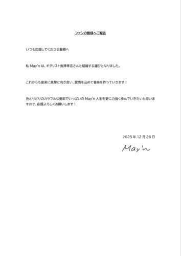 直筆の署名で締めくくった声明を公開。「私May'nは、ギタリスト長澤孝志さんと結婚する運びとなりました。これからも音楽に真撃に向き合い、愛情を込めて音楽を作っていきます!」とつづった。