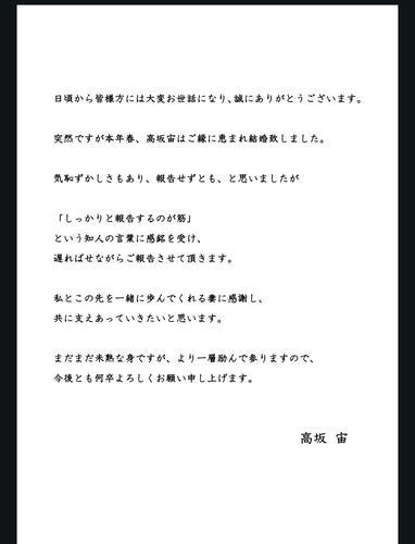 高坂は文書を添え「日頃から皆様方には大変お世話になり、誠にありがとうございます」と書き出し、「突然ですが本年春、高坂宙はご縁に恵まれ結婚致しました」と報告した。